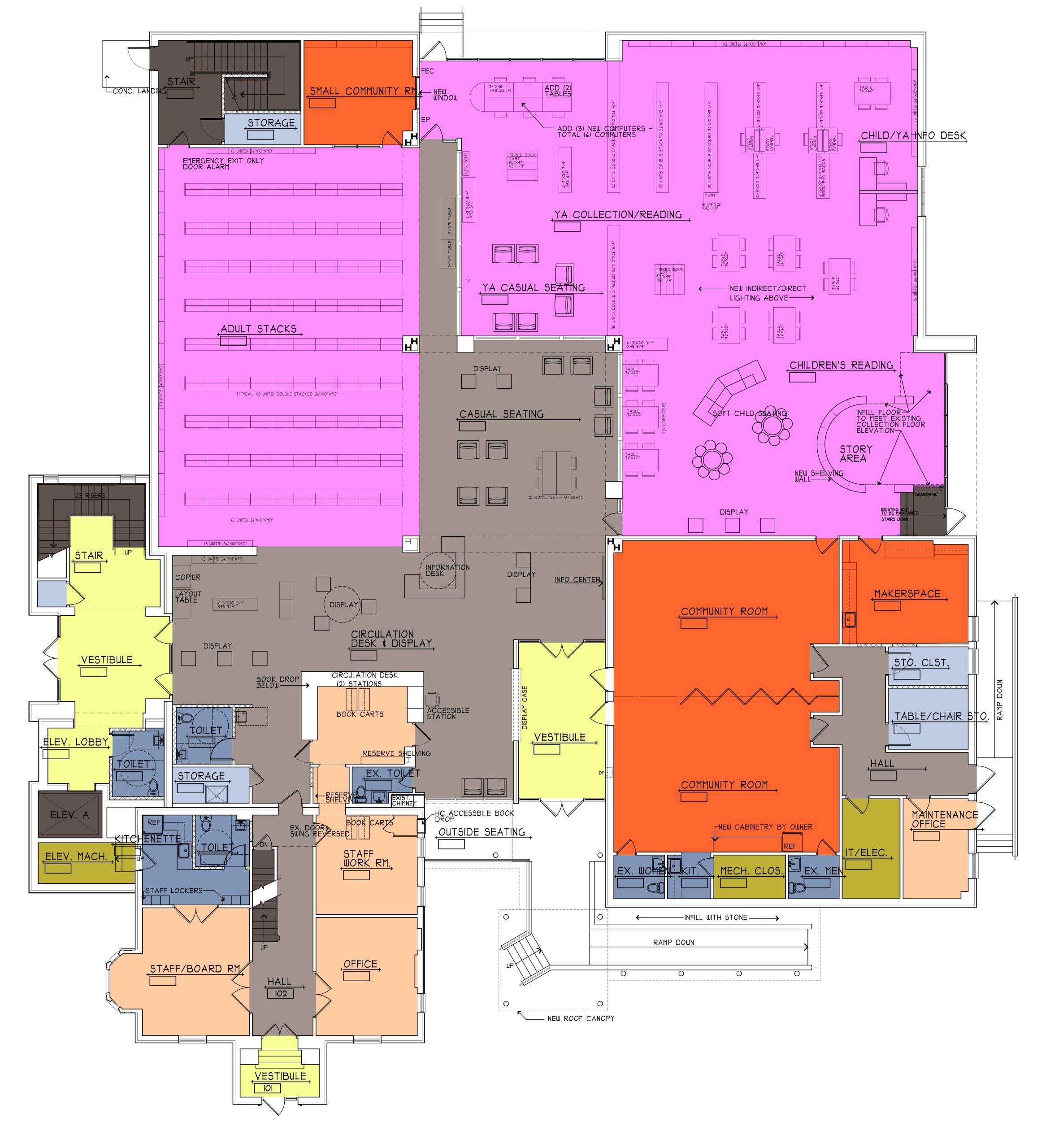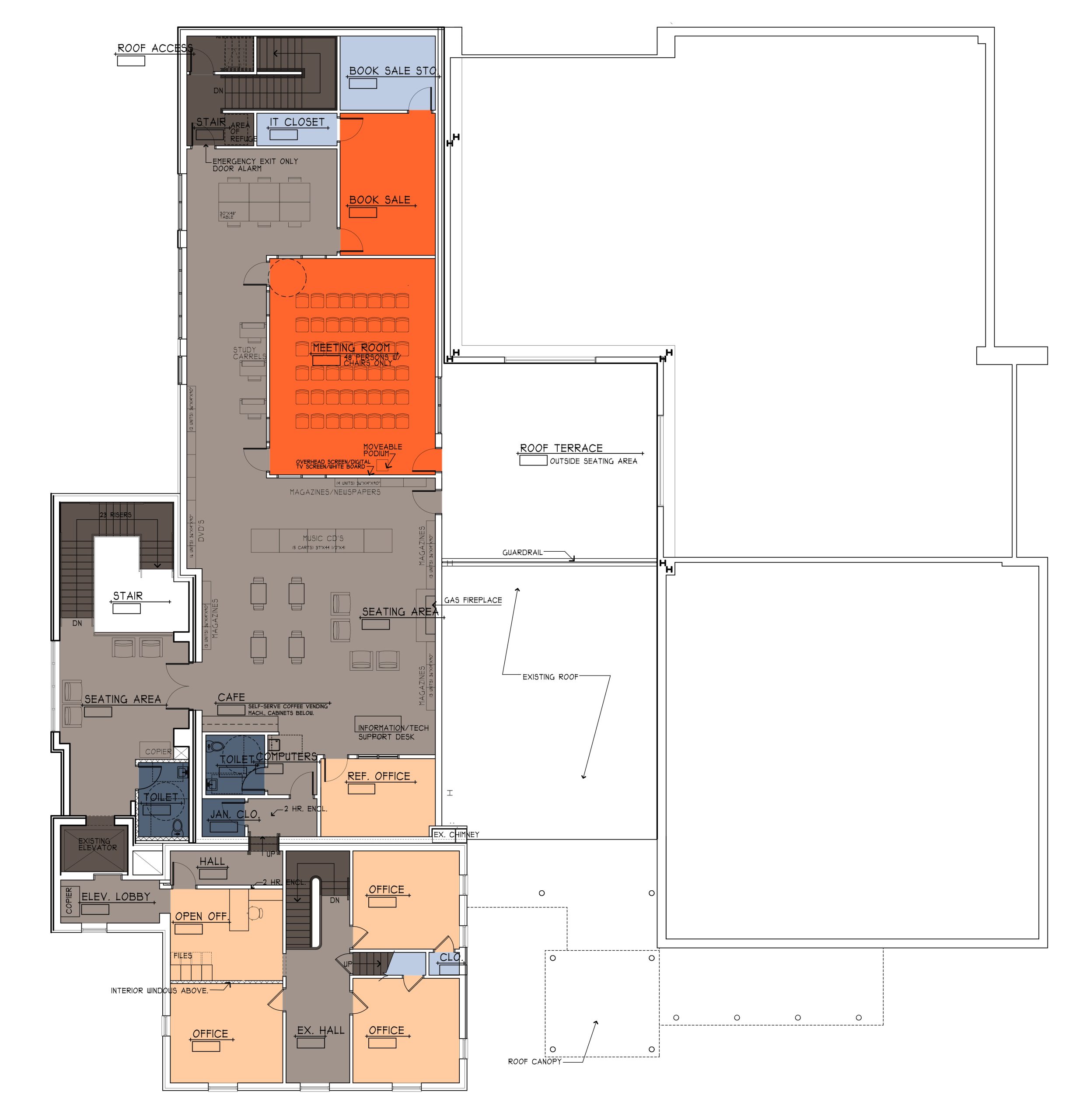 As library consultant, HKK provided library master planning services to develop schematic floor plans and concept sketches of the proposed renovations to the c. 1874 Dunham House and a new second floor addition to the existing one-story 1987 library building. Phase I was the reconfiguration of the existing Dunham House for administrative use. Phase II included renovation of limited areas on the first floor providing a new circulation desk, computer area, new toilet rooms and new finishes at the stack area and meeting rooms. Phase III is the new second-floor addition that will provide new adult meeting and computer spaces, an adult reading room, café, accessible toilet rooms and outdoor terrace. Future phases include exterior work to address site and storm water management and the design of a roof canopy over the main entry to reinforce the main building entrance and building identity, and the balance of the first floor.